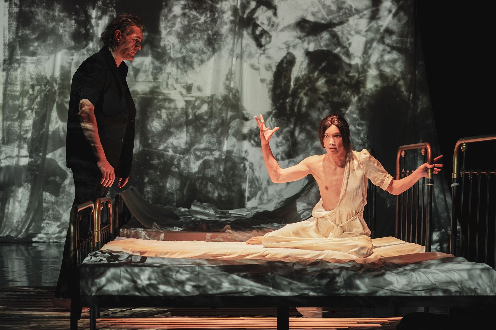 La première expérience de spectateur est esthétique. Sur le grand plateau du théâtre, une rangée de lits et des draps blancs qui recouvrent ce dortoir. Au fond sur un écran blanc des projections videos troubles finissent de figurer au sein d’une pénombre un lieu hors temps, le siège d’une tristesse, d’une solitude, mais aussi, l’endroit des amours adolescentes. Déjà nous pénétrons le théâtre astral, uranien de la psyché d’Herculine. Sur ce nuage onirique imaginée par Catherine Marnas, Herculine semble un ange. Interprétée par l’artiste non binaire Yuming Hey, elle est un ange attendrissant, fragile et évanescent. Le comédien, formidable de précision, mélange les genres pour rendre compte d’une corporalité singulière. Ses colères autant que son sourire bouleversent. Il fabrique par une géniale déréalisation l’abstraction nécessaire à nos réflexions. Il est tout à la fois notion refusant les archétypes.