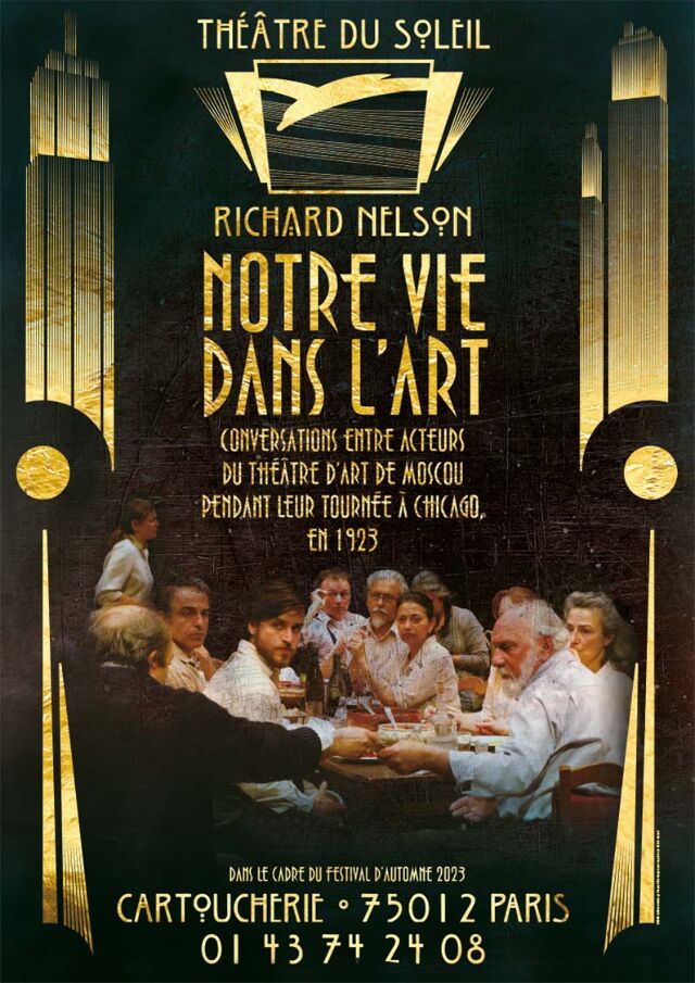 Notre vie dans l’Art s’inspire de la tournée historique du Théâtre d’Art de Moscou en Amérique en 1923-1924. Dans un dispositif bifrontal, au théâtre du Soleil si accueillant, nous avons rendez-vous avec un groupe d’acteurs russes emmené par le célèbre Stanislavski. La pièce écrite et mise en scène par l’américain Richard Nelson a comme sous-titre, Conversations entre acteurs du Théâtre d’Art de Moscou pendant leur tournée à Chicago, Illinois en 1923